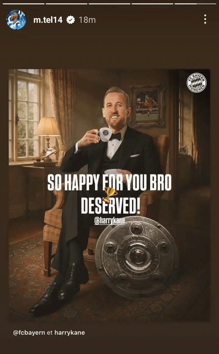 特尔在社交媒体上晒出了一张凯恩手捧德甲冠军奖盘的照片,并在配文中写道:“真的为你感到高兴,兄弟,你值得!”这一简短却真挚的祝福迅速引发球迷关注,也展现了球员之间的深厚情谊。